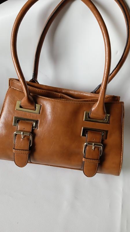 колір кемел як на фото,три відділення,два на кнопках одне на молнії, довжина сумки31см,ширина12,висота18,висота ручок 25см,дефектів немає