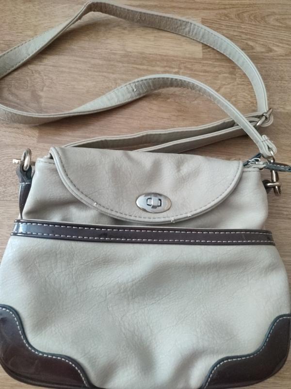 сумочка в бежевом цвете со вставками из коричневой лаковой кожи, достаточное вместительное содержимое, включает три отделения и позади карманчика, застегивающиеся на молнии Высота -20 см, длина 25 см, глубина 6 см, длина ручка сьемная, стала фурнитура и подкладка целым потертость на длинной ручке