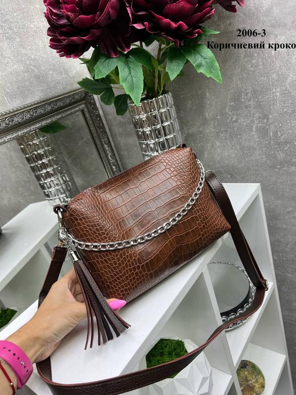 Штучна шкіра з кроко принтом. Україна 24х15х8 см Два відділення, кожне на блискавці. Усередині кишеня на блискавці. На зворотньому боці кишеня на блискавці. Максимальна довжина ремінця 135 см. Код 2006-3. ЗАМОВЛЕННЯ З ОПЛАТОЮ ПРИ ДОСТАВЦІ ТІЛЬКИ НОВОЮ ПОШТОЮ Уточнюйте на всяк випадок наявність