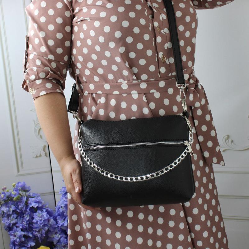 Новинка 💙 Код Д347 Размер: 25 см ширина по дну, 20 см высота, 9 см дно. Ремень регулируется до 140 см. Сумочка декорирована цепочкой, который можно использовать как ручку Материал: искусственная кожа Особенности: Два отдельных отдела. Внутри открытый карман и карман на молнии. На лицевой и обратной стороне карманы на молниях.