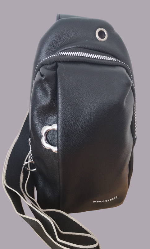 Сумка слинг из качественной гладкой экокожи, имеет два отдельных отделения на замке. Цвет черный.Высота 28, ширина 19, дно 4-4,4. Нова.