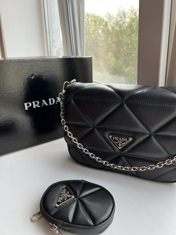 Сумка виготовлена з чорної еко-шкіри, простроченої. Усередині одне велике відділення та маленька кишенька на блискавці. Підкладка всередині сумки текстильна, з логотипами Prada. На ремінці є невеликий гаманець на блискавці. Є довгий ремінець на карабінах, так само декоративний ланцюжок. Комплектується у брендованій коробці та брендованому папері (має документи). Розмір 24 х 16 х 7 см