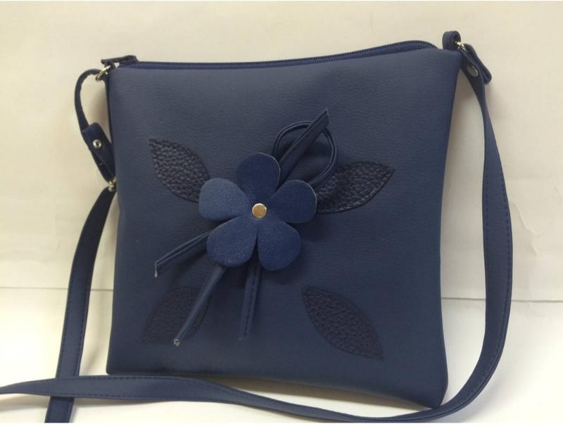 Сумка жіноча через плече з декоративною квіткою. Кожзам. Довгий регульований ремінець ( макс довжина 130 см). Одне відділення, внутрішня кишеня. Розмір 24х22 см, дно 3 см. Застібка-блискавка, підкладка.