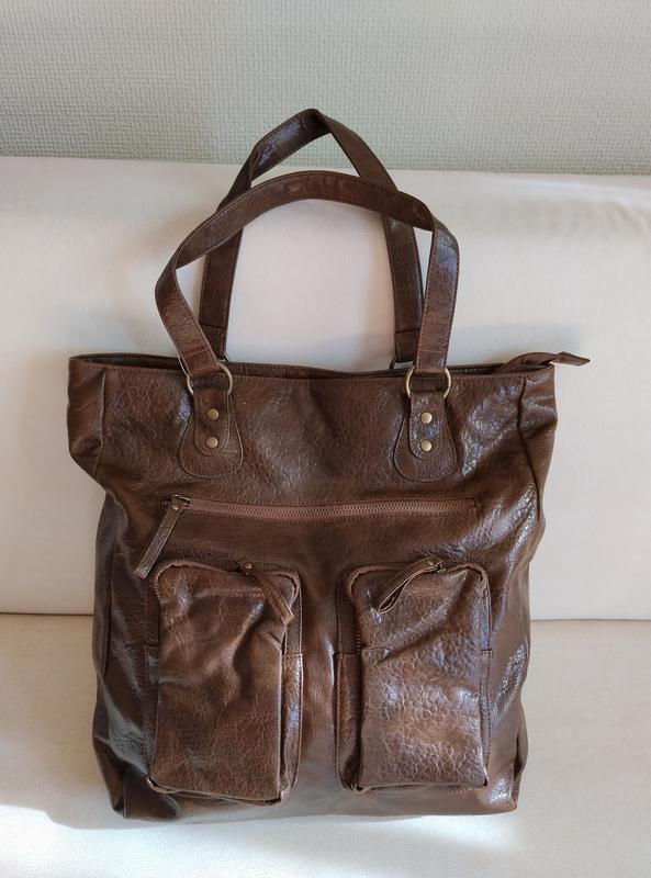 Зручна та містка сумка коричневого кольору, зі штучної шкіри, на двох ручках (також є довга ручка), з накладними та внутрішніми карманами, підкладка в симпатичну клітинку
