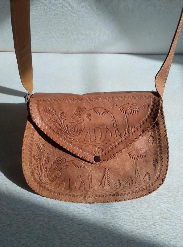 Шкіряна сумка ручної роботи (Індія) : оздоблення - тиснення по шкірі, застібка - кнопка, одна ручка, є маленька кишенька на блискавці.