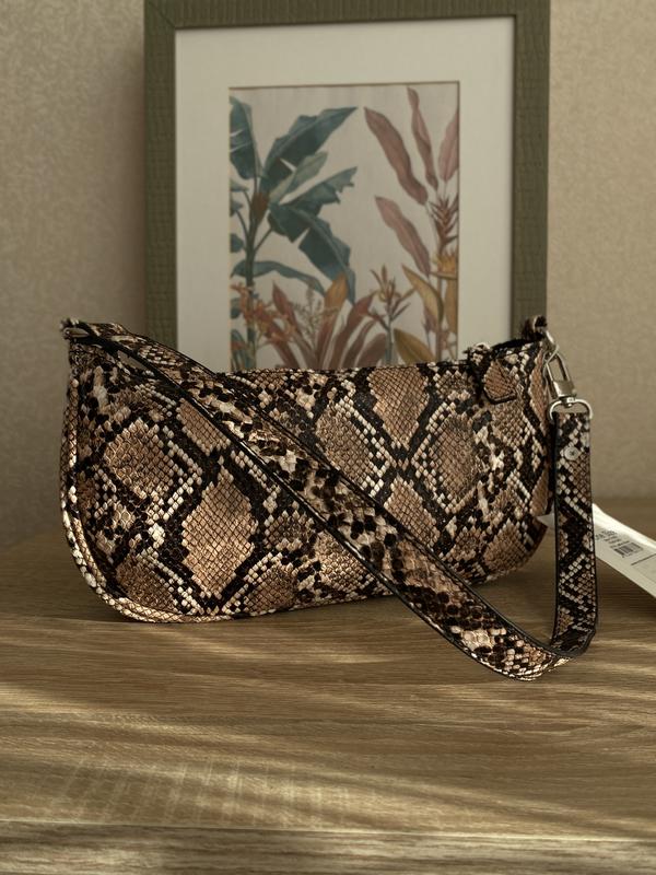 В наявності стильна нова сумка-багет від фірми Numph зі зміїним принтом Зроблена з якісної штучної шкіри, застібається на замок Розмір виробу: Довжина - 26,5 см Висота - 13 см Глибина - 4 см Довжина ручки- 56 см Сумка має підкладку, всередині є невеличка кишенька .