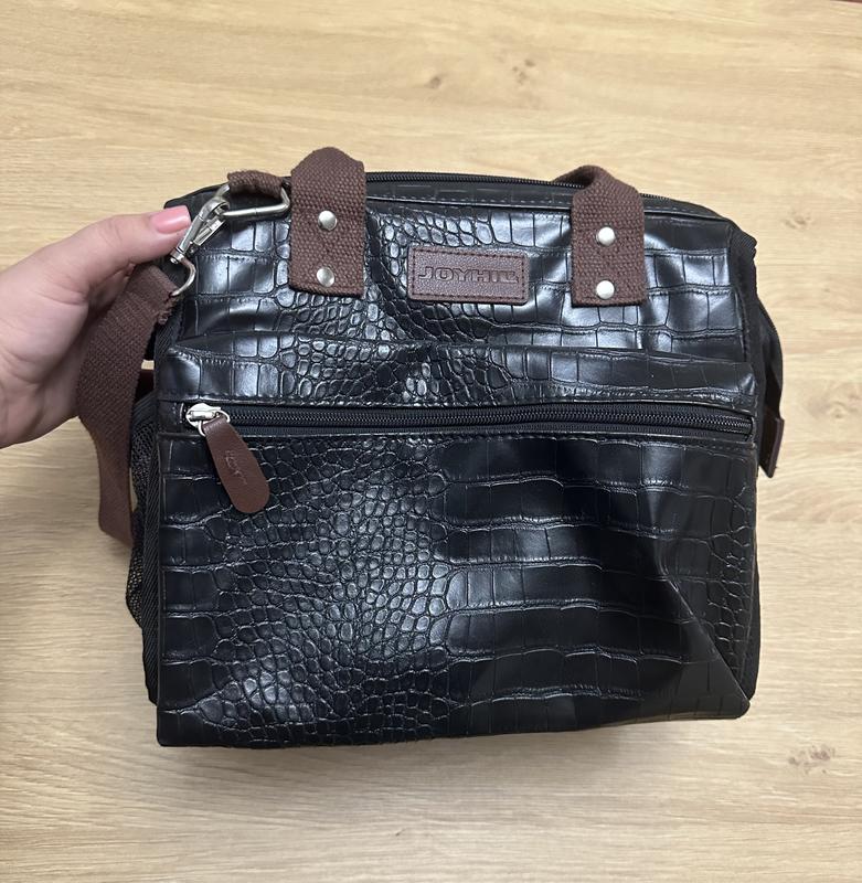 Жіноча сумка, зроблена під саквояж. Стан гарний без нюансів. Має 2 короткі ручки і довгий тканинний ремінець. Є кишеня містка із зовнішньої сторони, також дві кишені із сітки з боків. В середині по принципу термосумки( фольгований матеріал який тримає холод) . Заміри Ширина 27см Висота 25см Ширина дня 15см