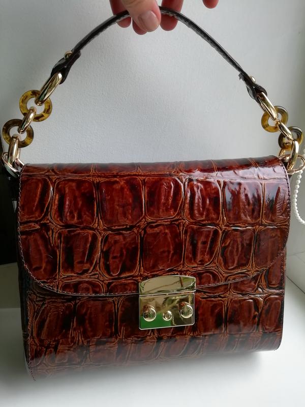 Жіноча сумка українського виробника. Лакована італійська шкіра та якісна фурнітура. Габарити 25×21×9. Вигуляла сумку один раз в ресторан.
