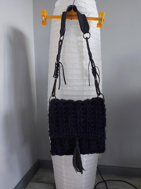 Интересная сумка Dasly Basic в идеальном состоянии. Сочетание кожи, замши и вязки. Ручка из кожи, боковые части и середина замшевые, подкладка из плотной ткани. Внутри карман застежкой.металл.молнией. Размер28x28см, длж.ручки от центра.сумки 48см.