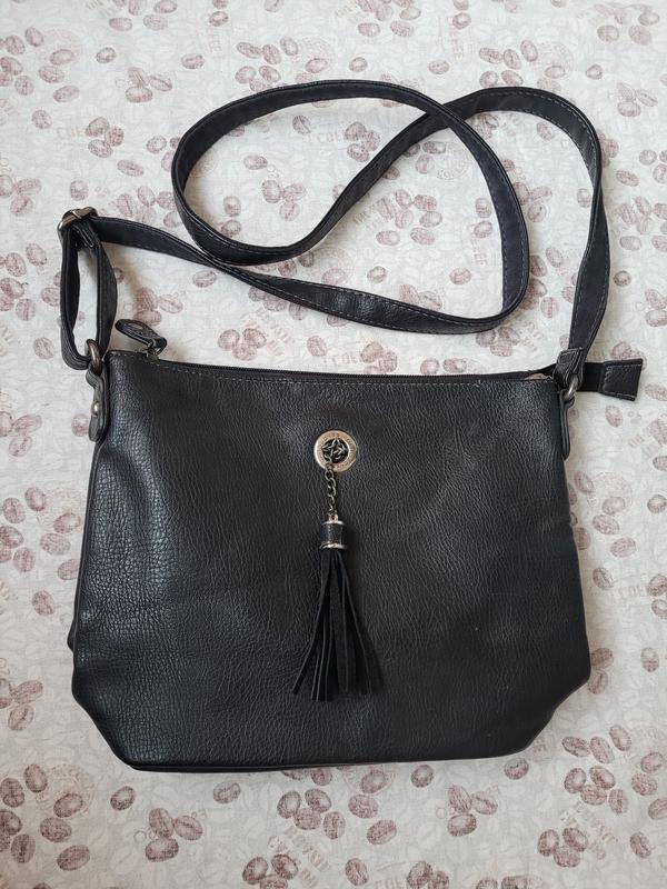 Кожзам, черная, б/у, следует подшить молнию (на последнем фото), нет 1 кисточки спереди сумки. Дно сумки идеальное.