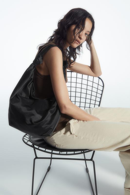 Нова, без навісних паперових ярликів Розміри: 30,5 x 22 x 10,5 см Сумка Hitch названа за складні вузли, які перемежовують її ремінець. Розроблена для того, щоб її можна було перекидати через одне плече, ця версія виготовлена з блискучого нейлону і пропонується в стійкому чорному відтінку, який доповнить більшість предметів у вашому гардеробі. Всередині ви знайдете кишеню на блискавці, щоб надійно розмістити ваші найнеобхідніші речі. Застібка-блискавка Підкладка з бавовняного полотна Перероблений нейлон зменшує наш попит на обмежені природні ресурси та зменшує викиди парникових газів Оболонка: 100% перероблений поліамід (перероблений нейлон), підкладка: 50% бавовна, 50% перероблена бавовна. За винятком оздоблення
