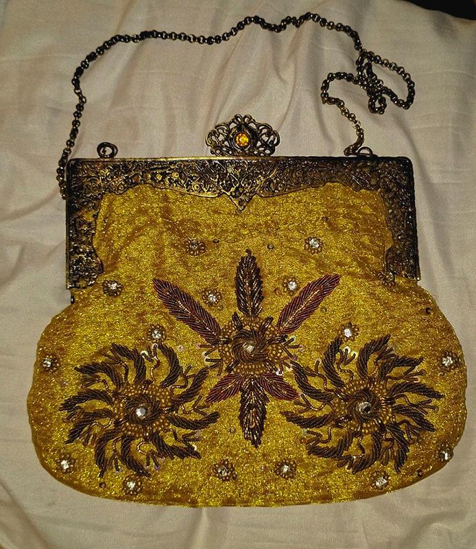 вінтажна сумка золотого кольору з металевою відділкою, вишита бісером, нитками, великими та дрібними блискітками. невелика за розміром, компактна, дуже якісна, в ідеальному стані.