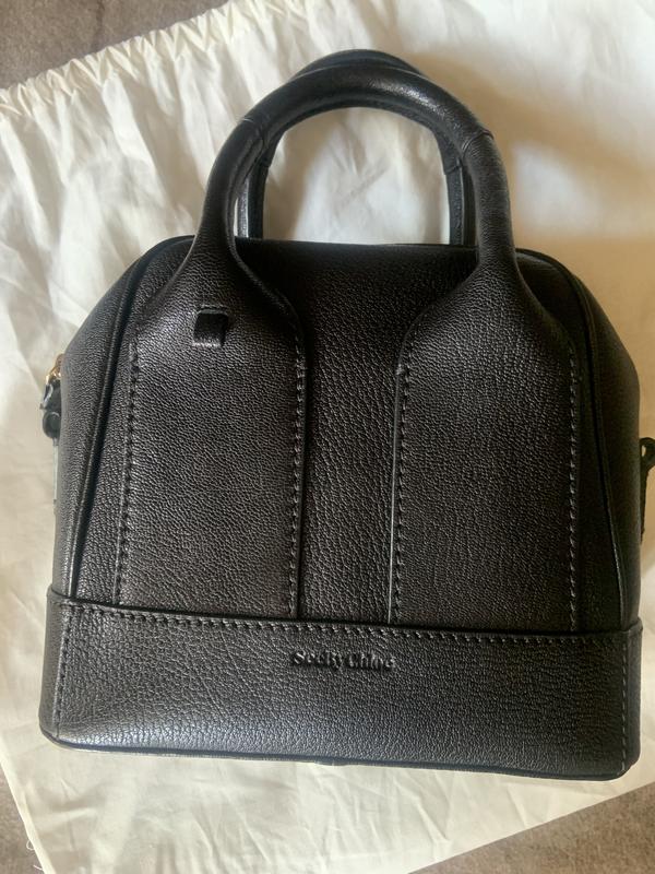 Чудова сумочка,чорна шкіра,стійка до подряпин,гарний розмір і форма,вмістка і зручна,ремінь знімається і регулюється,нова,пару раз вихід,замовляла у баєра плюс 10% ,є бірки і пильовик,на сумочці є петелька щоб вішати брелок чи якусь прикрасу) Ширина по дну 23,середині 26;висота 21,глибина 10