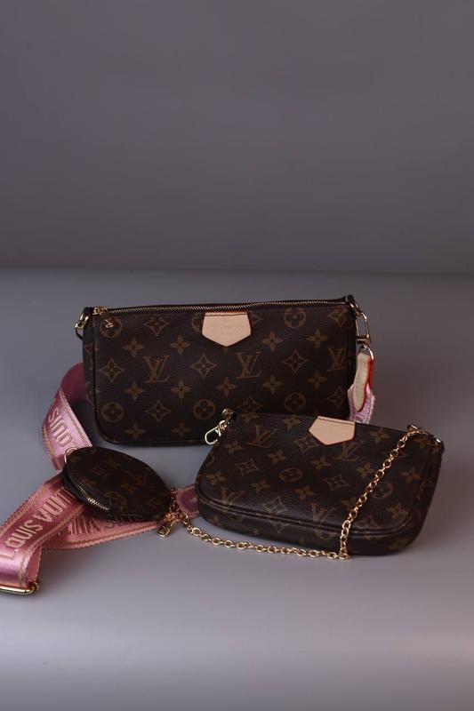 multi brown/pink Арт:0401: 💎Розмір: більша 23x13х3 менша 19х11х3 💎Матеріал: Еко шкіра Сумка виготовлена еко шкіри. Складається з двох окремих сумочок різного розміру - більшої та меншої, які кріпляться один до одного карабінами. Їх можна носити як окремо так і разом. Велика має два відділення. Підкладка текстильна. В комплекті ще є невеликий гаманець, що кріпиться до ремня. Ремінь текстильний з написом бренду, рожевого кольору, шириною 4 см, який регулюється 85 см до 122 см. На нього кріпиться невеликий гаманець діаметром 9 см. Фурнітура золотистого кольору. Також є металевий ланцюжок золотистого кольору довжиною 53 см. Пакування: брендова коробка, документи.
