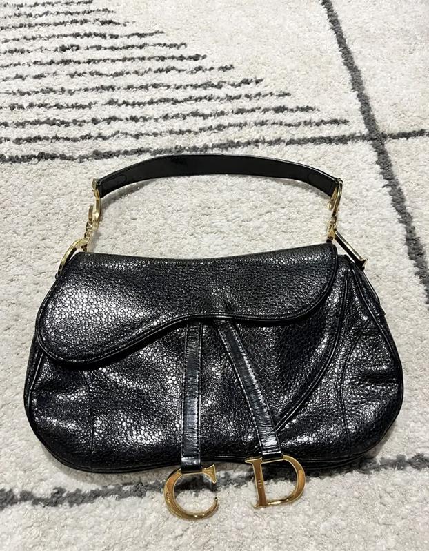 Подвійна сідельна сумка CHRISTIAN DIOR з телячої шкіри, чорна. Ця чудова сумка через плече Dior виготовлена з тонкої чорної шкіри з тисненням ската. Сумка має петельний шкіряний плечовий ремінь із латунними посиланнями на логотип Dior ініціалами та передній клапан із висячими латунними підвісками C і D. Клапан відкривається всередину з чорної тканини з кишенею на блискавці. Довжина: 28,5 см Висота: 19 см Ширина: 5 см