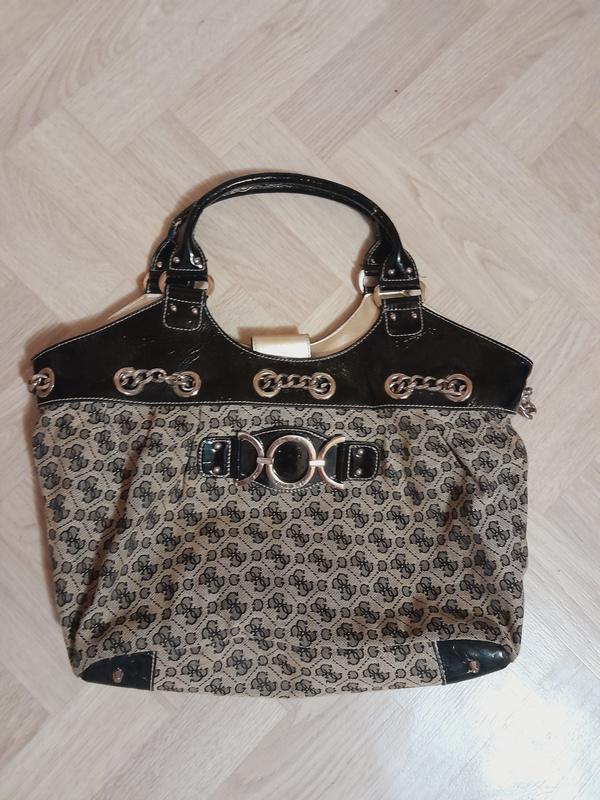 Класна, якісна, стильна сумка Guess. Шоколадного з бежевим кольору. 3 великих відділення всередині + бокова кишеня на блискавці + 3 невеликі кишені. Додатково відділення на блискавці позаду. 43х28см дно 13,5см сумка в чудовому стані, фурнітура також, окрім ручок, яі з внутрішньої сторони потерті. Сама дуже міцна та зносостійка!