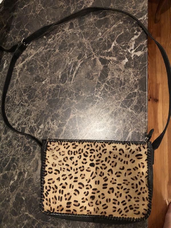 Шкіряна сумочка через плече} ручки регулюються застібкою на ремінці} дуже якісна , зовні леопардовий хутро поні} всередині безліч відділень Виміри: висота 15 см Ширина 22 см