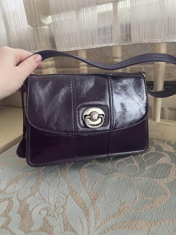 В новом состоянии, не носилась. Очень качественная натуральная лакированная кожа. Темный глубокий фиолетовый. На руке, в руке, на плечо.