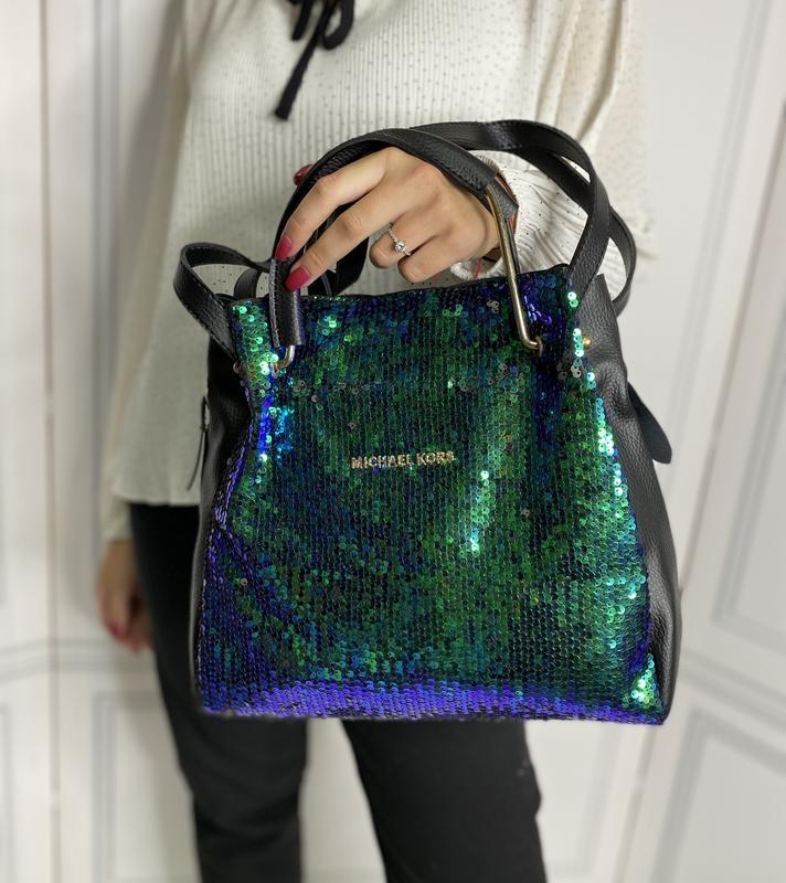 Красива сумка з яскравими паєтками. Виготовлена з Еко шкіри. Закривається на блискавку, всередині два відділення. В наявності два кольори. Розмір 27*30*13. Висота ручок 27 см Виробник Україна