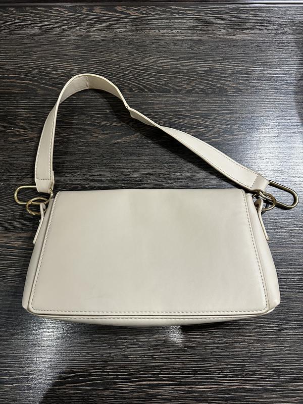 Жіноча сумка в бежевому кольорі на одне відділення. На внутрішній підкладці є незначні плями від косметики. На ручці трохи помітний залом через те, що довго лежала.