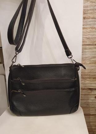 сумка турецького бренду Solana з щільної натуральної шкіри та якісної фурнітури з безліччю відділень та на довгій регулюємій ручці. Центральне відділення розподіляється на 3 частини з внутрішніми карманчиками, з лицьової сторони ще 2 відділення на змійці та з оборотної сторони теж відділення на змійці. Розмір ширина 27см, висота 20см,дно 8 на 27см, боки внизу 8см,зверху звужуються до 4 см.