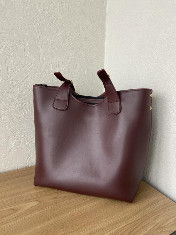 Сумна на два відділи, всередині ще декілька кишень. Вмістка, на коротких але зручних ручках. Розмір 30 на 40 см Єко шкіра
