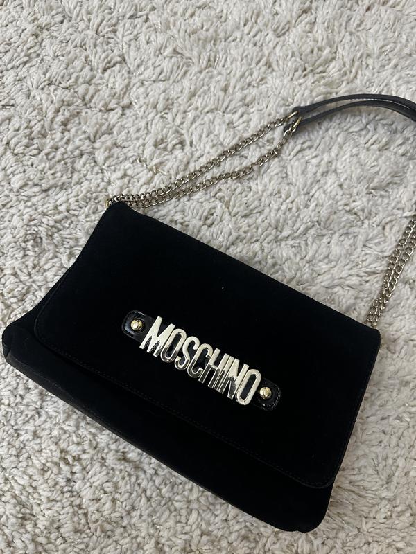 Стильна сумка Moschino • Стан: вживана, але як нова (без дефектів, потертостей чи подряпин). • Матеріал: високоякісний замш. • Колір: чорний, універсальний, підходить до будь-якого образу. • Фурнітура: металева, золотистого кольору, логотип Moschino додає елегантності. • Ремінь: ланцюжок із додатковою вставкою для зручного носіння на плечі. • Розмір: ідеально підходить для найнеобхіднішого (телефон, гаманець, ключі, косметика).