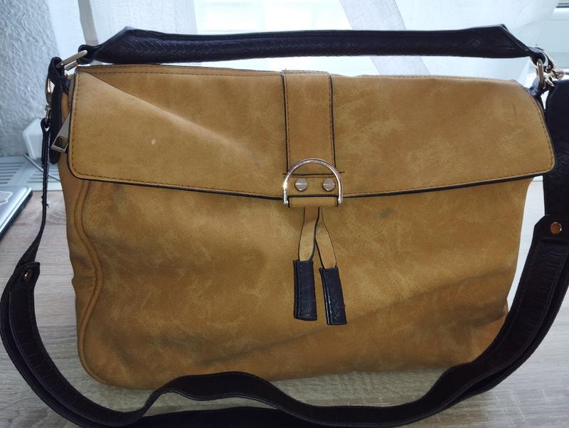 Дуже класна сумка, отримала один раз у відрядження, все в ідеалі, кромі тих плям, що на фото, поповила сумка, якалиця зверху.Стирати не Ширина 37 см, висота 26 см, глибина 14 см, довжина руч42 см і94 см на плече.Ручки ніде не потріскані.Дуже класна фурнітура