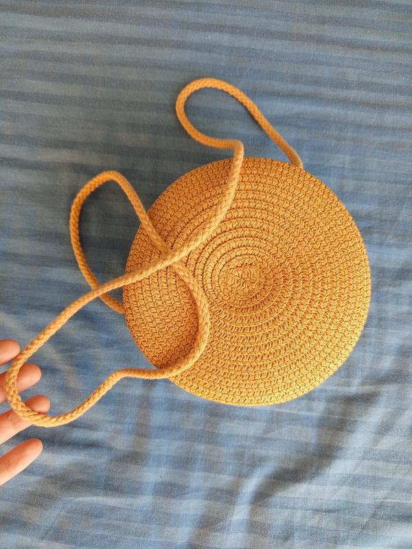 сумочка літня із солом'яного джгута, кругла діаметр 16, ширина 7, застібається на блискавку, має текстильну довгу ручку довжина 120, всередині одне відділення