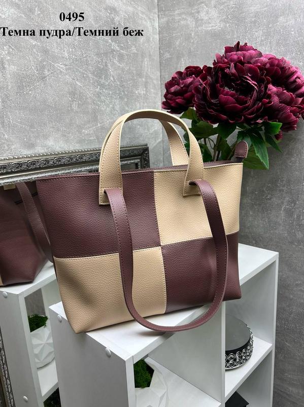 Штучна шкіра 32 см ширина по дну. 42 см ширина вгорі. 30 см висота. 13 см дно. Одне відділення на блискавці ,поділене навпіл перегородкою на блискавці . Усередині відкрита кишеня і кишеня на блискавці. На зворотній стороні кишеня на блискавці.