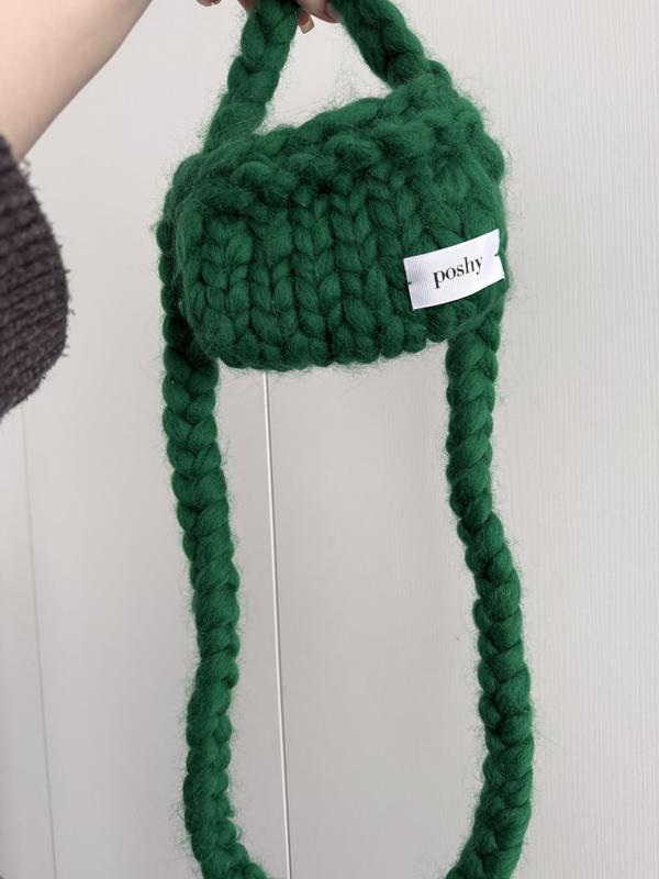 Вʼязана сумка від бренду Poshy, гарного зеленого кольору, дуже прикольно виглядає у реальному житті. Має маленьку ручку, та довгу, щоб носити як кроссбоди.
