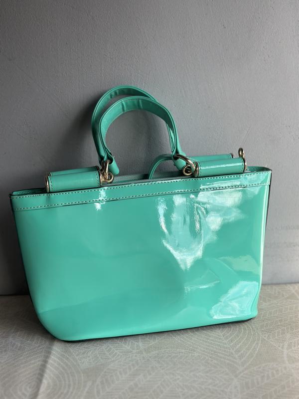 Сумка лакова бірюзового кольору, є довга ручка, вмістка. Є один недолік вказаний на фото. Висота - 19 см.