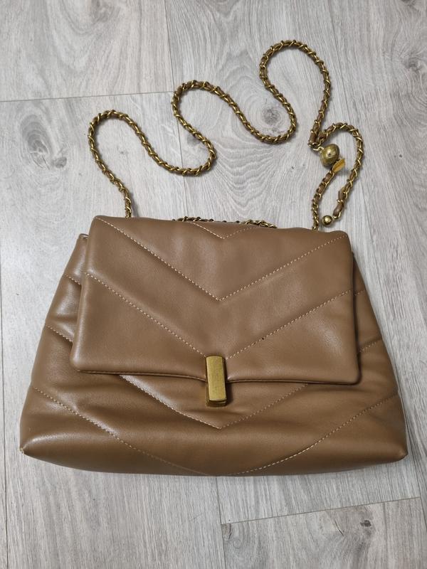 Сумка скосбоді, бежевого кольору, штучна шкіра, Aliexpress. Золота фурнітура має сліди часу, також трохи стерті кути сумки. в В середині одне цільне відділення, одна кешенька на молнії та 2 без молнії