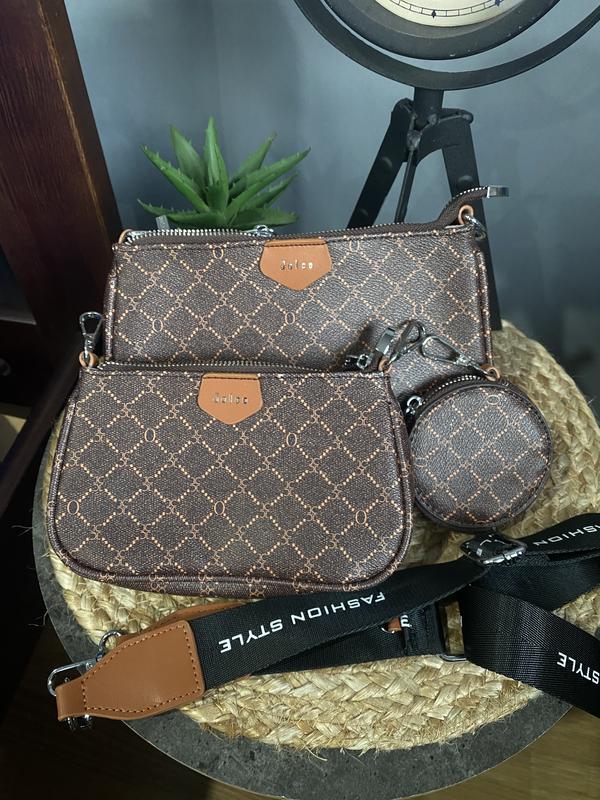 Женская качественная сумочка с брендированным принтом. В комплекте 3 единицы: сумочка, сумочка меньшего размера и кошелек. Ремешок на регулировке. Качественная фурнитура, эко кожа. С биркой, фабричный Китай