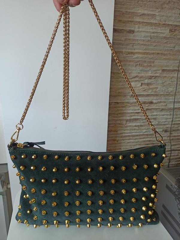 красивая сумочка из мягкой комбинированной кожи ( гладкой и замши) декорирована металлическими шипами. Размеры: высота 19см, ширина 31 см, длина цепочки 118см.