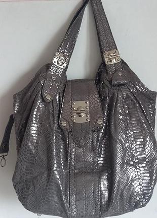 красива сумка з тканини з напиленням під рептилію ручки по середині - трохи витертость ( фото 5). форма м'яка. є бокові лемки, які можна застібнути всередині і придати більш круглу форму ціна символічна. Дно 33,5х16; висота по середній лінії 32см , ширина 48-40, при наполненни може бути і ширше, враховуючи крій сумки. Довжина ручки від середини однієї металевої заклепки до середини іншого - 39