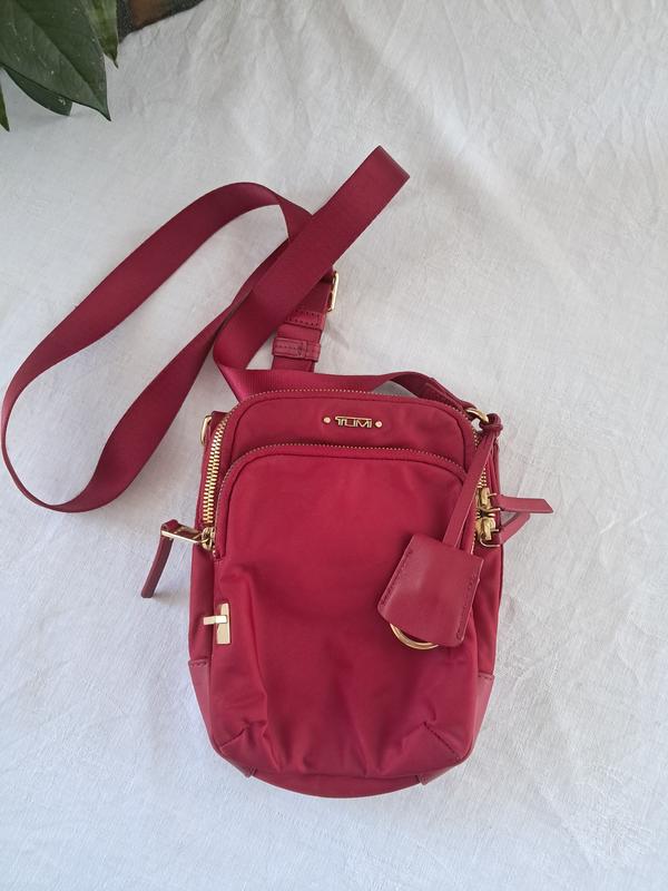 Сумка Tumi, Японія, 18×20 см, ширина дна 5 см, поясок регулюється 124+16 см, зовнішня кишеня на замок, одне відділення з кишенями для карт і замком для ключів. фурнітура брендована, мінімальні сліди використання, колір- цикламен.
