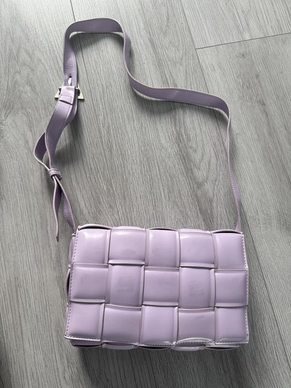 Елегантна сумка через плече ніжно-лілового кольору. В ідеальному стані. Виконана з міцного та приємного на дотик матеріалу з оригінальним плетеним дизайном. Ідеальний розмір для щоденних речей. Регульований ремінь дозволяє підібрати зручну довжину. Практичний знімний внутрішній карман на блискавці для дрібниць. Сумка поєднує в собі стиль, комфорт та функціональність. Заміри сумки надішлю за потребою.