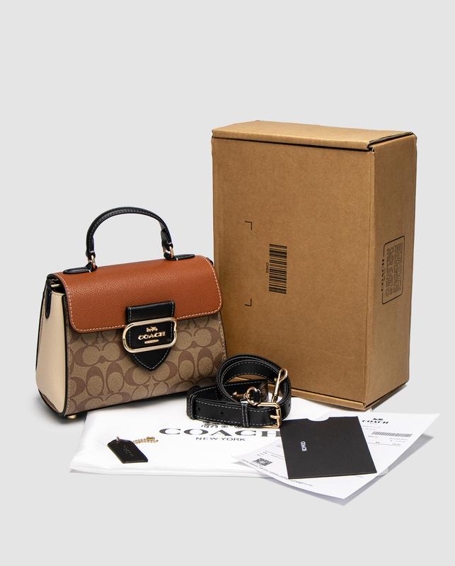 Сумка женская Coach Morgan Top Handle In Signature Canvas Brown Размер: 21 х 16 х 8. Материал: Кожа. Сумка выполнена из текстурной кожи с фирменной канвой. Внутри два основных отделения, также есть карман на застежке. Подкладка из бархатного текстиля, имеет фирменную нашивку в коже. Закрывается отделение на магните-клапане. Фурнитура металлическая, брендированная. Ремешок для ношения через плечо регулируется по длине. Комплектуется в фирменной коробке и пыльнике, есть буклеты. Повна оплата. Наложен платеж/Песля платья (Передъемка).