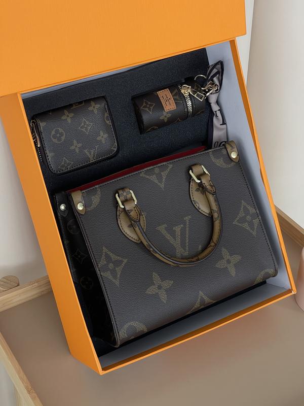 Подарунковий набір брендовий шопер тоут Onthego - 3 предмети Комплектація: Сумка: 1 шт Ключниця: 1 шт Гаманець: 1 шт Сумочка шопер тоут Onthegoу виконана з канви. Має один великий відділ, вишеню на близкавці та відкриту кишеньку для дрібниць. М'який червоний текстиль усередині з нашитим логотипом та бірочками. Мінца фурнітура в золоті та брендуєтся. Гаманець на два відділення та 4 відділення для банківських карток. У комплекті також ключниця - брелок Матеріал: шкіра, тримає форму. Розмір сумки: 25 * 19 * 11см Плечовий ремінь: 120см регулюється Гаманець: 10*8см Ключниця: 9см висота. код: коричневий 20435-1