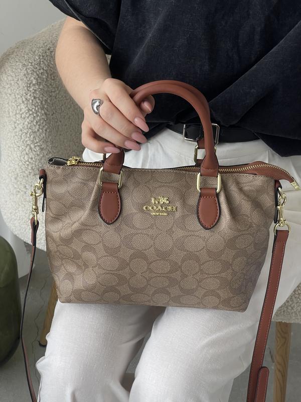 Сумка Georgia Satchel Bag Сумочка виготовлена зі структурованої еко-шкіри. Має одне велике основне відділення, всередині відкрита кишеня та ще одна на блискавці. Підкладка з нашитим логотипом і фірмовою біркою з QR-кодом. Фурнітура металева, брендована. Ремінець регулюється, максимальна довжина — 120 см. Розмір: 25х20х13см Матеріал: еко-шкіра ⭐️ Пильовик в комплекті код: коричневий 20356-1 коричнево-бежевий 20356-2 біло-бежевий 20356-3