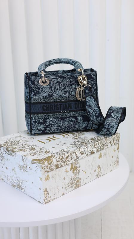 Medium D-Lite dark blue Преміум якість ⭐ 📌Арт: 1009P: 🔗 Розмір: 24х20х11 🔗 Матеріал: Текстиль Сумка виконана з бавовни з фірмовою вишивкою. У сумці одне велике відділення, яке закривається текстильним капюшоном. В середині має бокову відкриту кишеньку та на блискавці кишеньку. Підкладка текстильна. Прикрашена металевою підвіскою. Сумку можна носити як у руці, так і на плечі, завдяки знімному та регульованому текстильному плечовому ремінцю. Фурнітура золотистого кольору. Пакування: брендова коробка на магнітах, пильовик, хустинка, буклети.