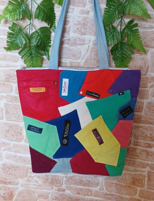 Яскрава літня сумка з джинсової тканини.Розмір 42 см на 35 см,дно 12 см. Зовні 2 накладні кишені і 2 кишені всередині.Закривається на блискавку.Ручки 60 см, сукреплені стропою.