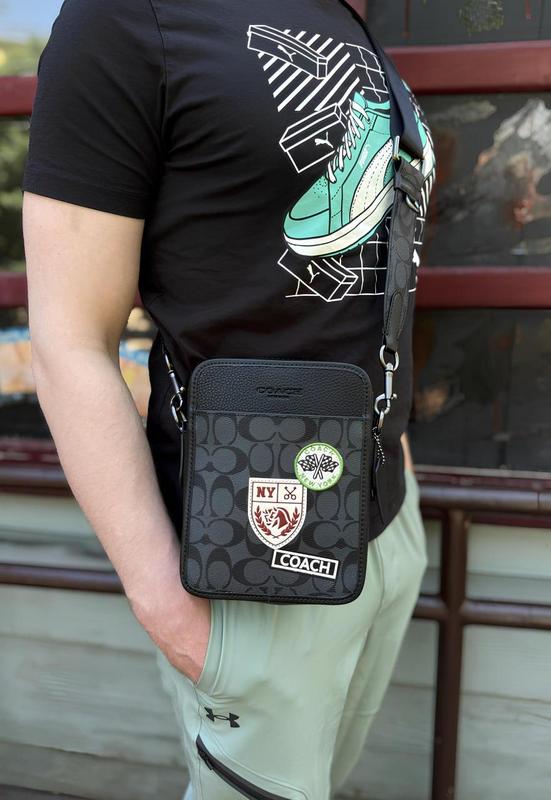 Сумка чоловіча COACH Sullivan Crossbody In Signature Canvas With Patches код: чорний 20115-1 Сумка виготовлена з шагреневої шкіри і гладкої телячої шкіри. Одне відділення на близкавці . На лицьовій стороні карман відкритий . Підкладка з тканини та нашитий логотип Якісна фурнітура з логотипами Ремінець із щільного текстилю, має регульовану довжину для носіння на плечі або через плече - максимальна 144см Розмір: 17*22*6см Матеріал: шкіра
