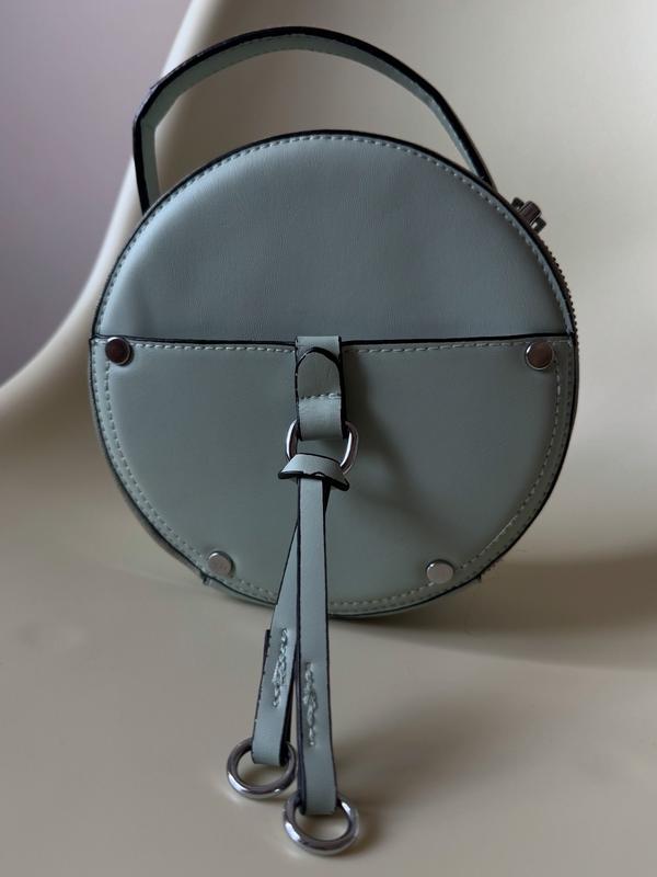 Круглая сумка-бочка оливкового цвета, есть длинный ремешок, вместительная