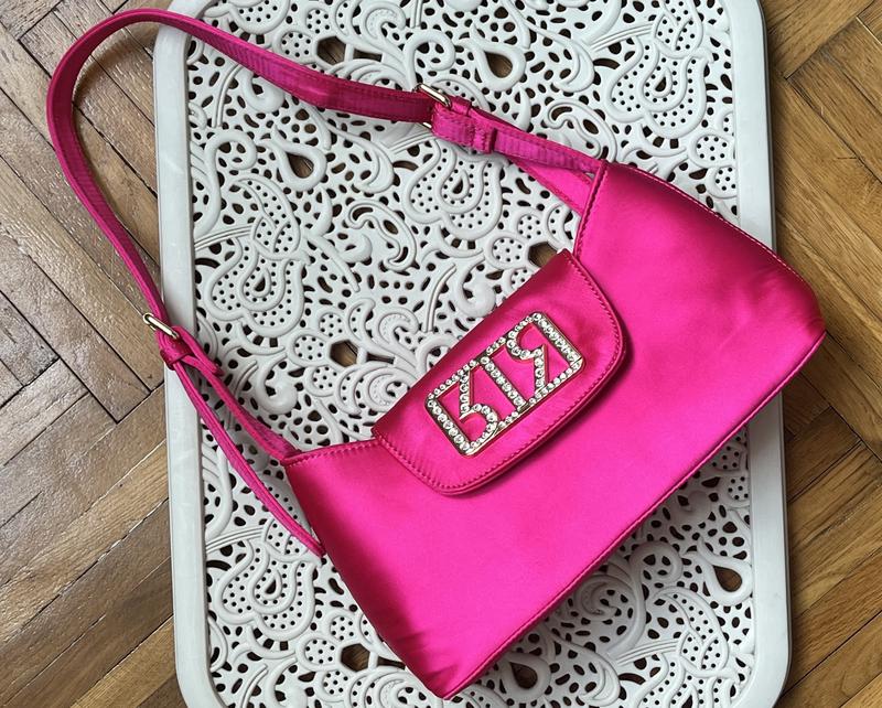Cумка River Island яскравого рожевого кольору з атласу, є маленькі дрібні недосконалості ( на фото доповнила ), всі камінці на місці.