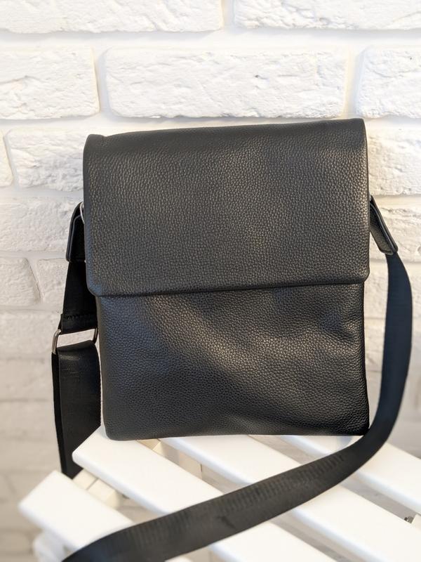 Чоловіча класична шкіряна сумка для планшету чорного кольору. Виконана із натуральної зернистої шкіри флотар. Висота 27см, ширина 24см. Всередині 3 відділення під загальною змійкою, є додатково внутрішні кишеньки. Також містке відкрите зовнішнє відділення. Зі зворотного боку також кишеня на змійці для дрібниць.