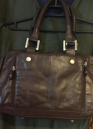 Шкіряна містка сумка, кольору молочного шоколаду. Розміри: ширина-36, висота-24, глибина-13. Ручки короткі, тільки носити в руці, дефектів немає, незначні сліди носіння на підкладці