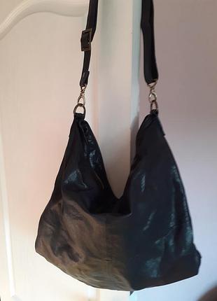Сумка-мешок, черная, большая, кожаная, на молнии, производство - Германия. Ширина - 50 см, высота - 40 см, глубина - 14 см. Длинный ремень через плечо. Одно большое отделение + один внутренний карман на молнии + два отделения для мелких вещей.