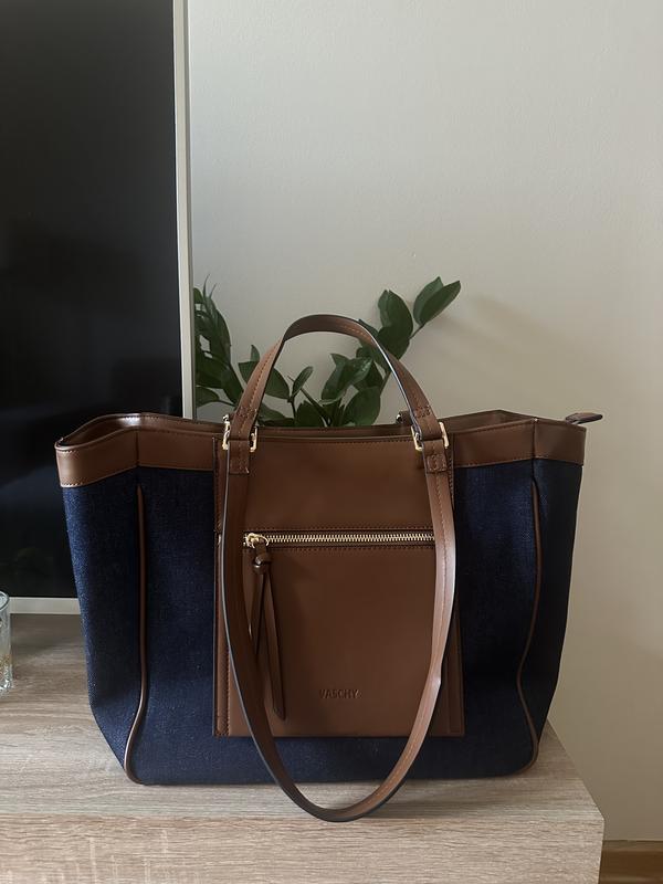 Жіноча сумка-тоут у вінтажному стилі з щільного текстилю (канвас) із декоративними вставками з екошкіри. Має квадратну зовнішню кишеню на блискавці. Виглядає дуже стильно та пасує до будь-якого образу. Завдяки двом типам ручок сумку можна носити як у руці (сумка-сетчел), так і на плечі. Легка та містка: Розміри: • Ширина (низ): 33 см • Глибина: 14 см • Висота: 30 см • Верхня ширина: 46 см • Довжина коротких ручок: 14 см • Довжина довгих ручок: 31 см • Вага: 800 г